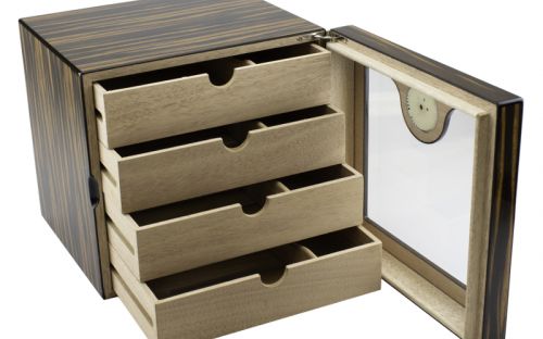 Humidor szekrény 80 szivar részére, 4 fiókkal, külső higrométer, üveg ajtós - Makassar, Achenty