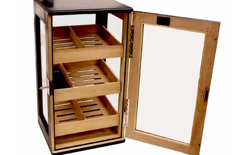 Humidorszekrény - szivar tároló szekrény 80-100 szál szivarnak, spanyol cédrusfa, párásító, digitális hygrométer - körbe üveges, fekete
