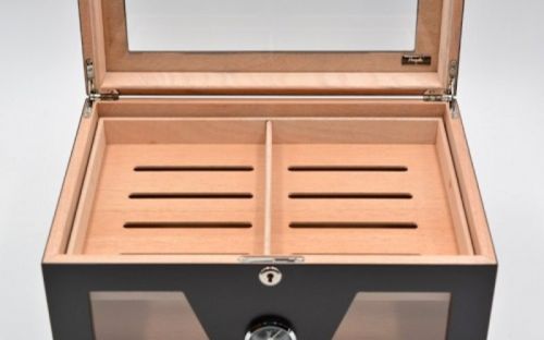 Gasztro humidor 80 szál szivar részére, üveges szivar doboz, cédrusfa, külső hygrométerrel és párásítóval - fekete