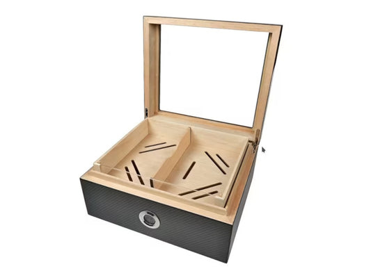 Achenty! Gasztrohumidor 80 szál szivarnak, akrilltetős szivartartó doboz, spanyol cédrusfa, párásító és hygrométer - carbon