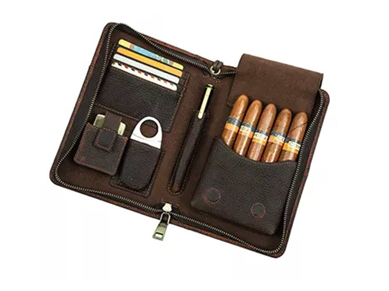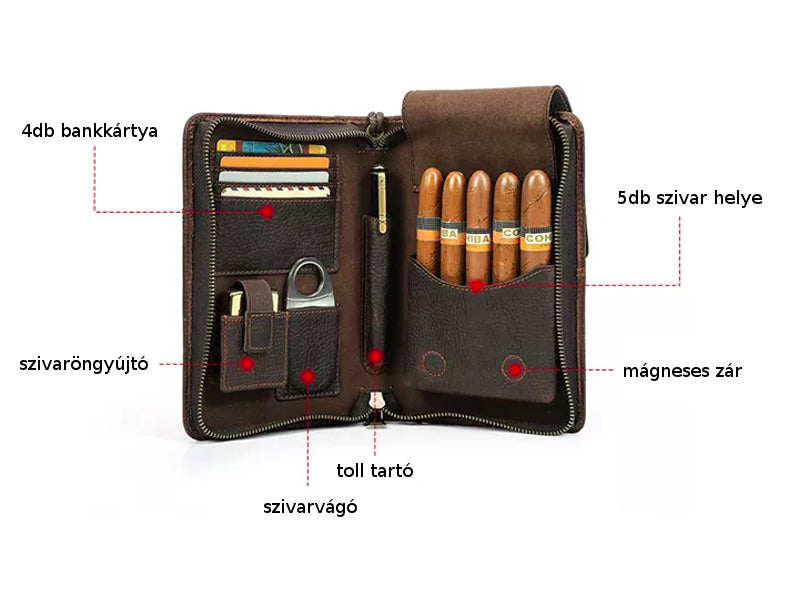 Hordozható, utazó szivartartó táska kiváló minőségű bőrből készült, kávébarna színben. A, finom megmunkálású, könnyű és elegáns, kényelmes és modern kialakítású, kis méretű szivar tárolóban 5 szivarnak van hely, és egy pánttal ellátva, így kézre is akasztható, így magunkkal vihetjük kedvenc szivarjainkat biztonságosan.. A szivarozáshoz elengedhetetlen szivar vágónak és szivar öngyújtónak is van kialakítva patentos kis zseb. Az elején kialakított telefontartó zseb, a belsejében 4db bankkártya és igazolványtartó, valamint egy tolltartó. Hátsó részén cipzárral záródó zseb egyéb iratok számára.