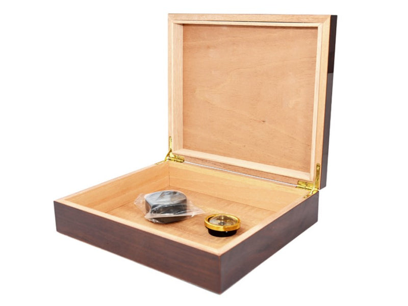 Akrylpolimer kristályt tartalmazó kör alakú párásítóval és belső hajszál-higrométerrel, süllyesztett zsanérokkal. A humidor alja filccel bevonva, hogy megóvja a bútorokat a karcolódástól.