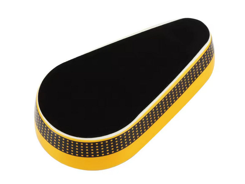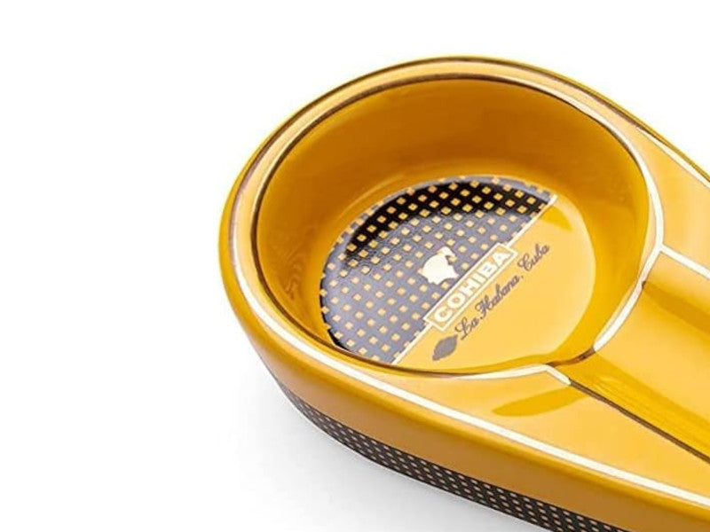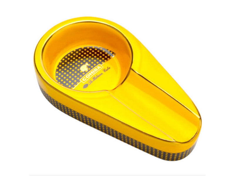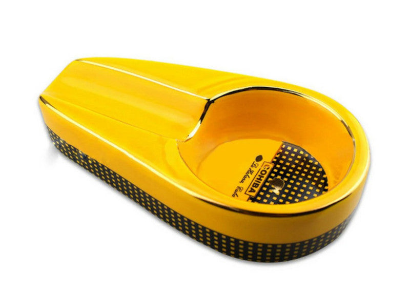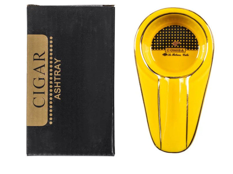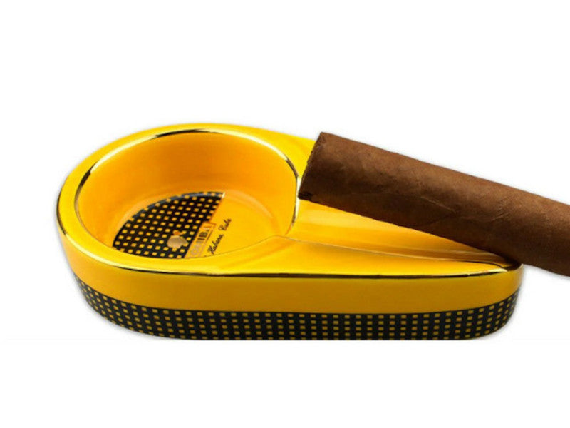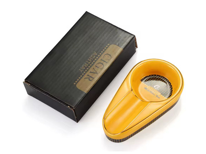 Sárga színű kerámia szivar hamutartó arany színű szegéllyel, ellipszis forma. 1 szivar elhelyezéséhez tökéletes helyet biztosít. Kényeztesse magát egy kifinomult szivarozási élménnyel a különleges csepp alakú egyedülálló kialakítású hordozható kerámia szivarhamutartóval. Alján egy fekete bársonybetét található, így nem kell attól tartani, hogy megkarcolja az asztalt.